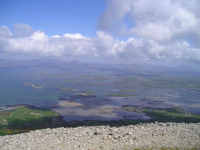 "... Az út felfelé rendesen kb. 2, lefelé 1-1,5 óra. Mi másfél óra alatt felszaggattunk – így sietve legalább nem fáztunk -, végig felhőben menetelve, az esőkabát és vízhatlan nadrág ellenére alsóneműig vizesen. Nem sokat beszélgettünk sem mi, sem mások, csak néhányszor bátorítóan egymásra mosolyogtunk: nem vagy egyedül, én is fázom és vizes vagyok, már nincs sok hátra. Láttunk néhány embert, akik mezítláb mentek végig, talpuk sebes volt, de nem látszott rajtuk a fájdalom. Nem volt ritka a 60 éven felüli idős ember sem, aki majd minden évben itt van, zakóban és esernyővel a kezében menetel – minden évben egy kicsit lassabban – mintha csak templomba menne. A Máltai Szeretetszolgálatnak és a hegyimentőknek néha bizony segíteni kellett levinni az idős és beteg zarándoklókat, de érdekes módon a tetejéig sikerült még eljutniuk. A legkegyetlenebb szakasz közvetlen a teteje előtti, ez leginkább egy jól szituált kőbányához hasonlít, meredek, nagyon nehéz terep. Különösen mezítláb... Nagyon sok család is menetelt együtt, apuka vonszolta a két-három sokszor egészen pici gyerkőcöt, akiktől szintén egy pisszenést sem lehetett hallani. Ezeknek a gyerekeknek teljesen természetes, hogy minden évben elzarándokolnak ide, a vallás hozzátartozik az életükhöz. Ezek a rítusok, valamiféle támpontokat is jelentenek az élet útvesztőiben, és éreztetik velük, hogy egy közösséghez tartoznak. Az életet talán azzal is teszi boldogabbá a hit, hogy leegyszerűsíti azt. Ezek az emberek hisznek abban, hogy bűnbocsánatot nyernek a hegy tetején, és tiszta lélekkel könnyedebb léptekkel jönnek le. Minket nem neveltek vallásosan, de hiszünk, még ha nem is járunk túl gyakran templomba, és ezen a napon nagyon jó érzés volt a zarándoklók tömegéhez tartozni. Állítólag több, mint húszezren voltunk. Visszafelé gyönyörű meglepetésben volt részünk, kitisztult az ég, sütött a nap, csak a hegy tetején trónolt makacsul egy felhő. Láttuk, ahogy megannyi hangyaként másznak az emberek a hegycsúcs előtti meredek oldalon, és mesés volt a kilátás a tőzegvidékre és az előttünk elterülő ezer apró szigettel tarkított Clew Bay-re."