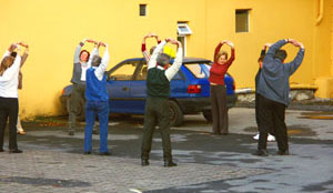 Reggeli előtt - mint általában minden reggel - egy kedves zarándoktársunk vezényletével reggeli tornát is tartottunk. Most különösen szükségünk volt a bemelegítésre, hiszen teljesítmény-túrának is beillő hegymászásra készültünk.