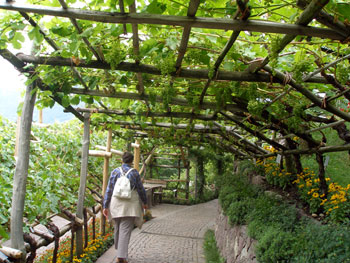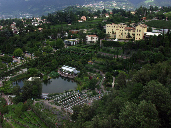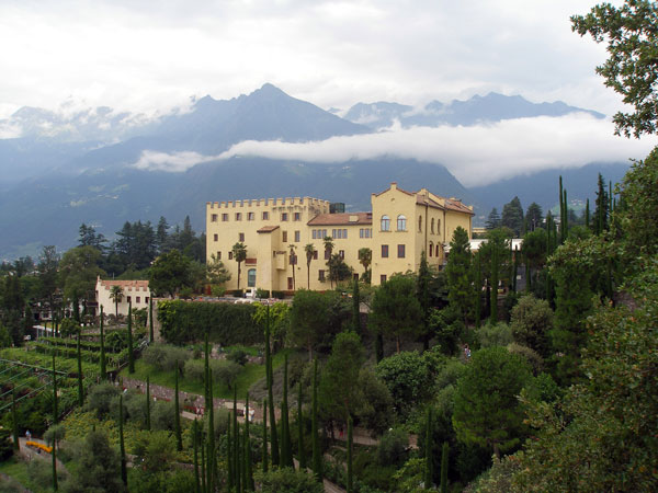 Meran/Merano - korábban Dél-Tirol tartományi székhelye - 3000 m magas hegyek gyűrűjében csak déli irányban nyitott völgyben 325 m tengerszint feletti magasságban fekszik. Éghajlata mediterrán jellegű, a napsütéses napjainak száma 300 körül van. Az utcákat pálmafák szegélyezik, de megél itt a ciprus, a babér, a mirtusz és a libanoni cédrus is.
