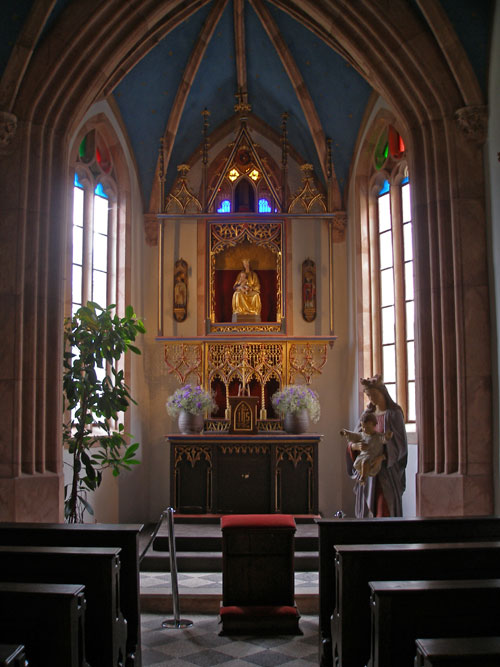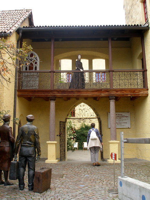 A múzeum első udvarában Sissi fogadja a turistákat, Sissi mellett a kis fehér ajtó a kastély-kápolnába vezet: