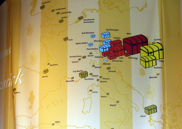 Egy tábla, amely azt mutatja, hogy Sissi hol, mennyi ideig tartózkodott: Ausztria (piros), érthetően a legnagyobb láda Bécs, Magyarország (sárga), Gödöllő bőröndje nem sokkal kisebb a bécsinél, Németország (kék), s zöld a további országok.