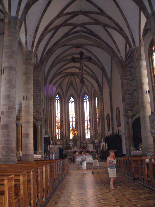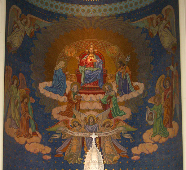 Bár volt konkrét célunk is, amiért ide jöttünk. Plébániánk, a Zugligeti Szent Család templom csodálatos mozaik képe ugyanis a meráni Angolkisasszony zárdatemplom mintájára készült. Eredeti tervem szerint itt a két képet együtt szerettem volna bemutatni. Sajnos tervünk nem sikerült. A templomot ugyan megtaláltuk, de az, szemmel láthatóan "üzemen kívül" van. Semmiféle, még csak utalást sem találtunk arra vonatkozóan, hogy a templomban bármiféle élet folyna. A zárda gimnáziumként funkcionál, s érthetően nyáron nem működik. Besétáltunk az udvarra is, de életnek nyomára sem akadtunk. Így nem marad más, mint csak a mi templomunk szentélyének Zsellér Imre műhelyében készült gyönyörű mozaik-képét mutathatom meg: