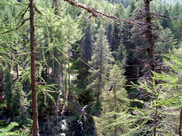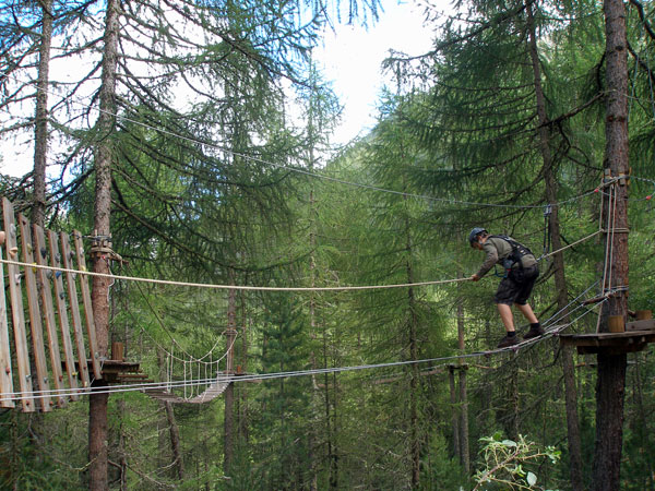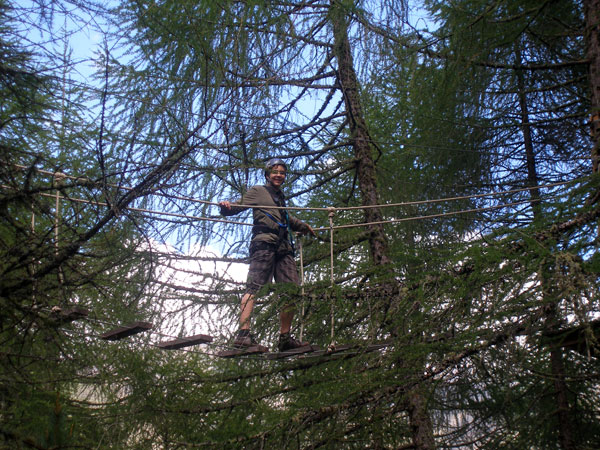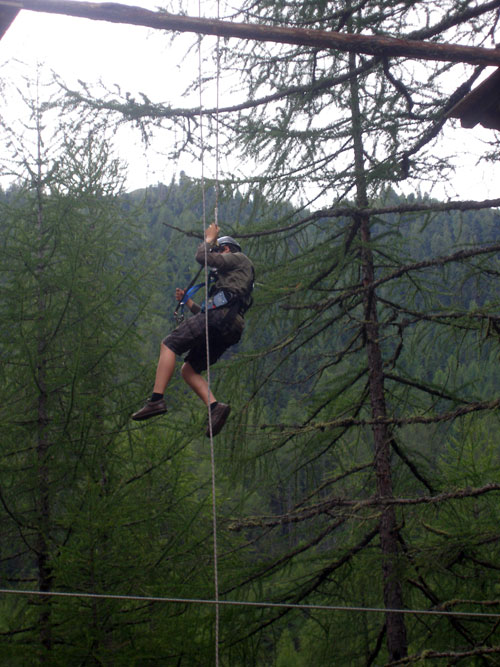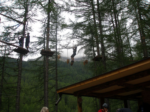 Másnap megérkezett a már oly sokszor beígért eső, így a délelőttünket pihenéssel, játékkal és kisebb sétával töltöttük el. Délutánra kisütött a nap, felkerekedtünk s a helyi autóbusszal lementünk a tőlünk tán 5 km-re lévő Ötzi Rope-parkba, hogy valami olyat is megmutassunk, ami egy 15 éves fiúnak a kedvére lehet.