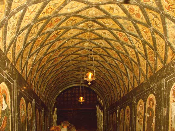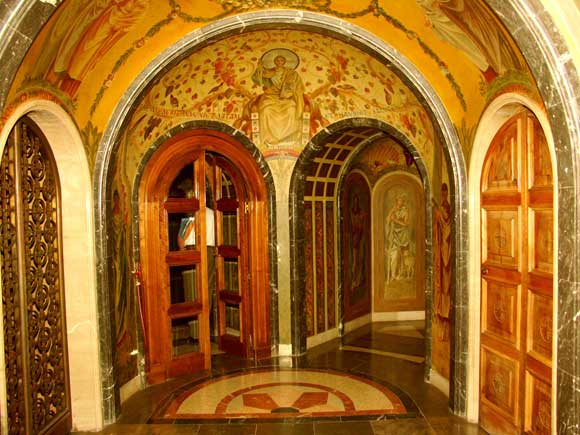 A lépcső teteje: balra bejárat a Madonnához, a félig nyitott faajtó a szentségi kápolnához vezet, mely a Madonna-szobor mögött van