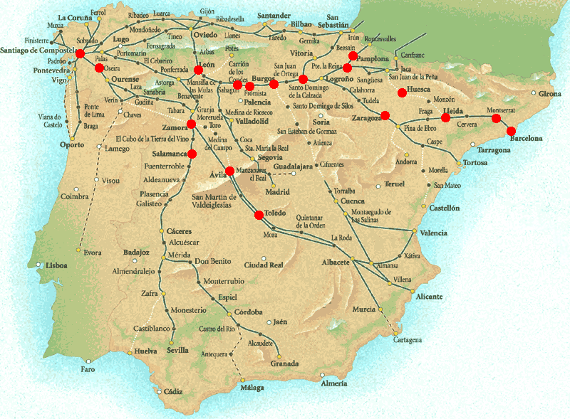 A Szent Jakab zarándokút spanyolországi részei Spanyolország szinte minden végéből indulnak a különböző nevű zarándokutak. Talán a legismertebbek és legnépesebbek a "Francia út" és az "Ezüst út". A következő térképen ezek a zarándokutak láthatók (a piros pontok azok, amelyeken mi is megálltunk):