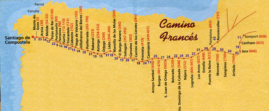 S végül a leglátogatottabb Francia út nyomvonala. Ebbe kapcsolódik a valamivel keletebbről induló Aragon út. Ez a Somport hágóról induló út a Francia úttal együtt 836 km Santiago de Composteláig, melyet a gyalogos zarándokok 30-33 nap alatt tesznek meg - s amely a mi zarándokutunk alapja is volt.