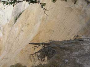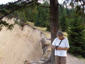 A terület folyamatosan mozog, némely fenyőnek a gyökere már a mélység felé meredezik. Jövőre talán a ma még a meredély szélén álló fenyő is a mélybe csúszik majd.